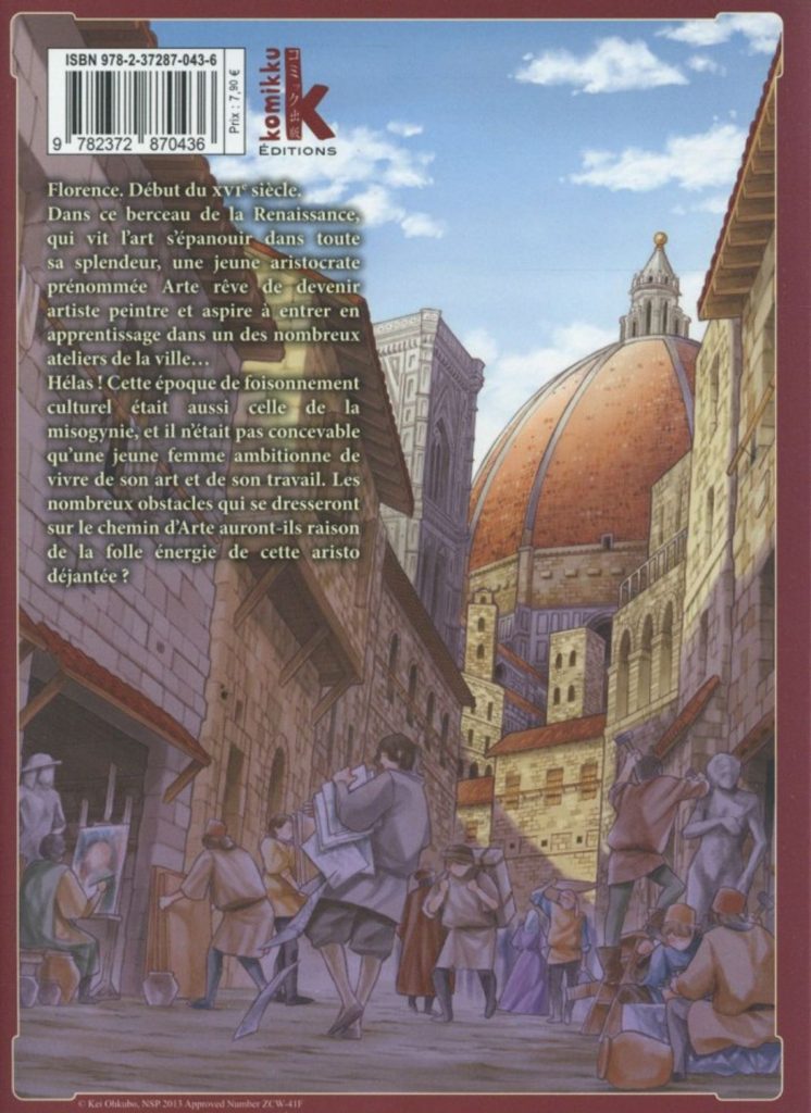 Avec beaucoup d’humour et de tendresse, mais aussi un dessin très doux, Kei Ohkubo nous transporte dans cette Italie post-médiévale. Les vues des villes qu’Arte traverse sont délicieuses, notamment par leur foisonnement et leur minutie. Pour parvenir à un tel rendu, l’autrice explique à plusieurs reprises qu’en plus des importantes recherches qu’elle a dû réaliser, elle s’est rendue à de nombreuses reprises à Florence, et plus généralement en Europe, pour s’imprégner tant de l’Histoire, de la culture ou de l’ambiance de cette ville que de son architecture et ses couleurs.