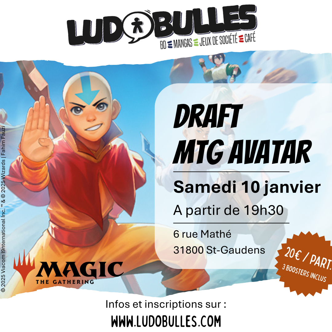 Pour débuter l'année en beauté, Ludobulles organisera sa première soirée Draft Magic the Gathering ext. Avatar le samedi 10 janvier. dès 19h30 pour un début de partie à 20h max. La soirée se découpe en 3 temps : on drafte, on construit son deck, on s'affronte. Fin prévue aux alentours de 0h00-1h00. Inscription vivement souhaitée […]